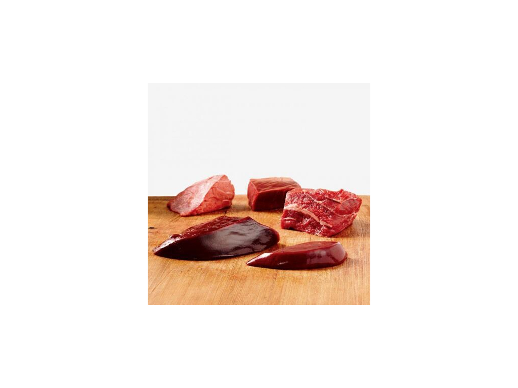 Kompletní krmivo pro psy ve formě na hrubo mletého masa a drobů s přidanými minerály.