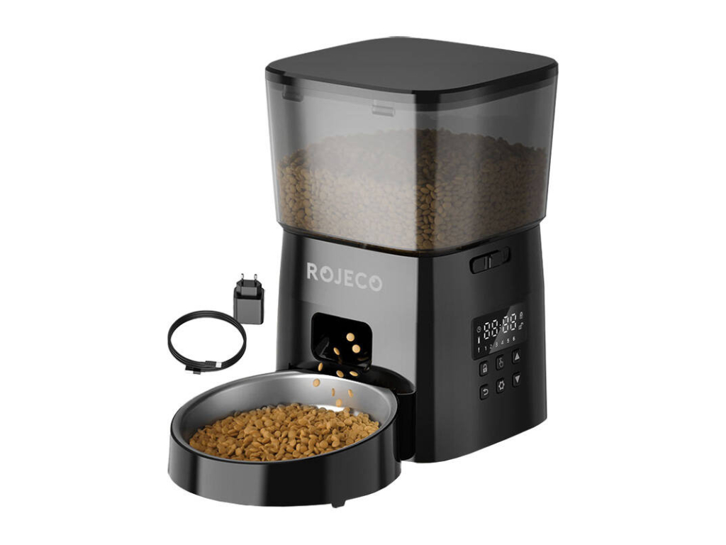 Naplánujte si rozvrh krmení přizpůsobený potřebám vašeho domácího mazlíčka. Chytrý dávkovač Rojeco poskytne vašemu mazlíčkovi během jednoho dne 1 až 6 jídel, která mohou obsahovat až 16 porcí krmiva.