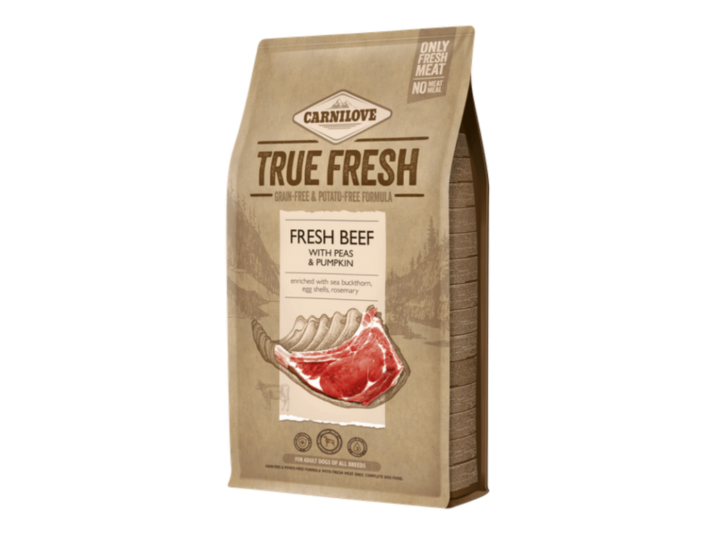 Kompletní krmivo pro dospělé psy všech plemen Carnilove True Fresh Beef Adult. Receptura obsahuje čerstvé hovězí maso a je zcela bez obilovin a brambor.