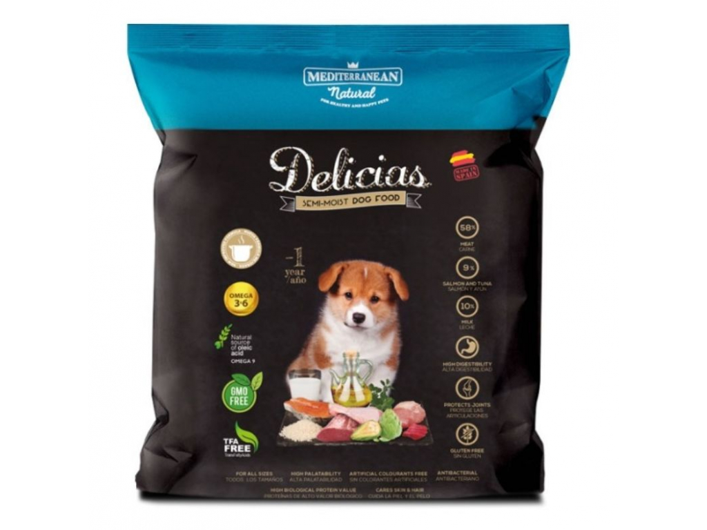 Španělské poloměkké krmivo Delicias pro psy pro dospělé psy a štěňata s vysokou chutností a stravitelností. Speciálně vyvinuto pro malé a střední plemena a pro ty psy, kteří mají potíže s konzumací suchého krmiva. Obsahuje extrakt z krabů a extrakt z krevet (zdroj glukosaminu), který podporuje vývoj chrupavkových tkání. Balení lze vzduchotěsně uzavřít. Produkt je bezlepkový, neobsahuje GMO ani trans-mastné kyseliny, je bohatý na mastné kyseliny Omega 3 a 6.