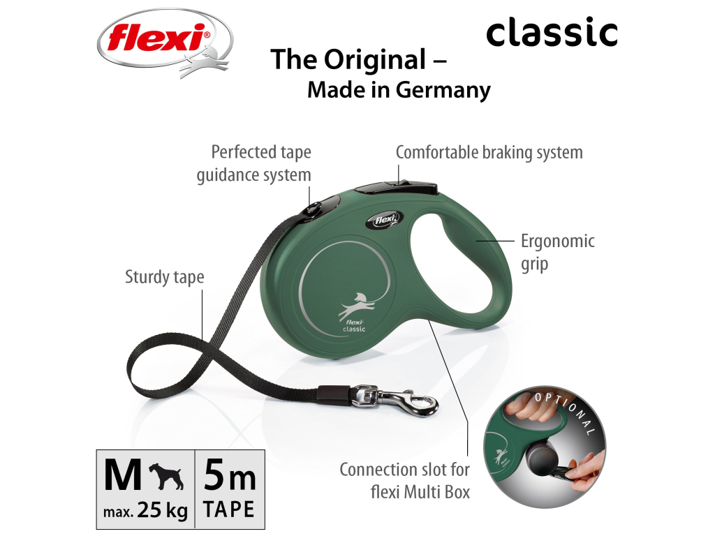 Vodítka flexi® Classic nabízí pohodlný úchop, odolný navíjecí systém i kvalitní, bezpečný a intuitivní brzdový systém, který ve zlomku vteřiny zastaví pohyb psa. Pro snadné upevnění vodítka k obojku nebo postroji je vodítko opatřeno chromovanou karabinou. Samozřejmostí je zdokonalený výstup pásku, který zajišťuje manipulaci v libovolném směru bez zasekávání - potvrzeno nesčetnými testy.