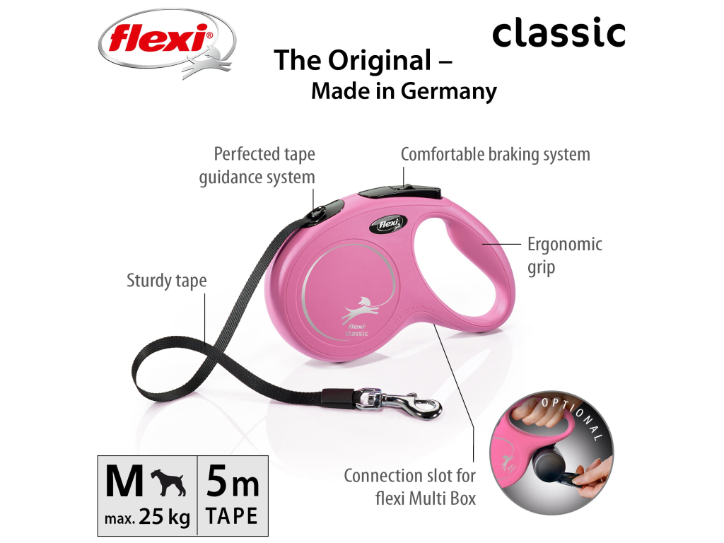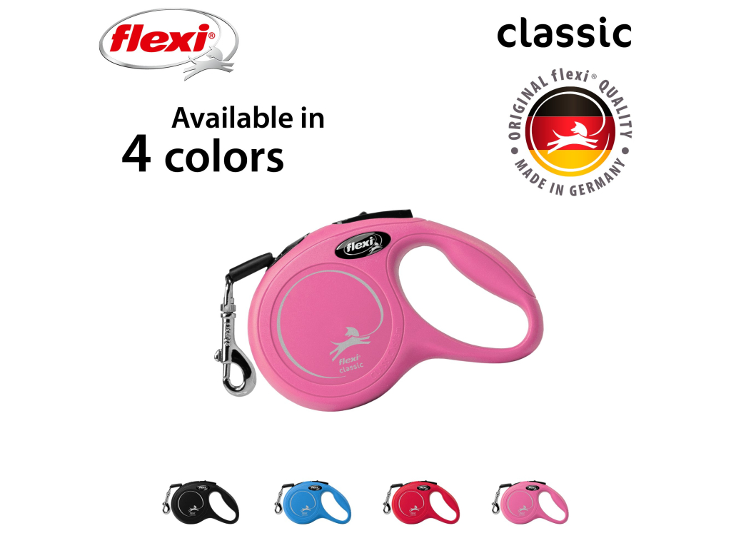 Vodítka flexi® Classic nabízí pohodlný úchop, odolný navíjecí systém i kvalitní, bezpečný a intuitivní brzdový systém, který ve zlomku vteřiny zastaví pohyb psa. Pro snadné upevnění vodítka k obojku nebo postroji je vodítko opatřeno chromovanou karabinou. Samozřejmostí je zdokonalený výstup pásku, který zajišťuje manipulaci v libovolném směru bez zasekávání - potvrzeno nesčetnými testy.