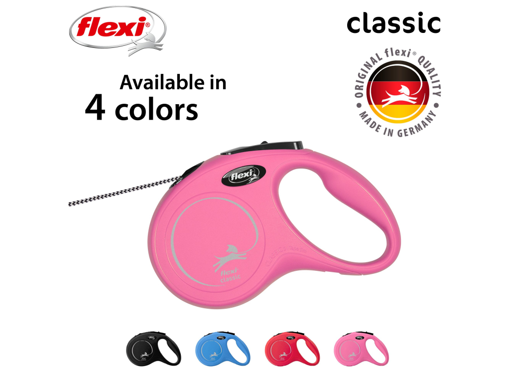 Vodítka flexi® Classic nabízí pohodlný úchop, odolný navíjecí systém i kvalitní, bezpečný a intuitivní brzdový systém, který ve zlomku vteřiny zastaví pohyb psa. Pro snadné upevnění vodítka k obojku nebo postroji je vodítko opatřeno chromovanou karabinou.