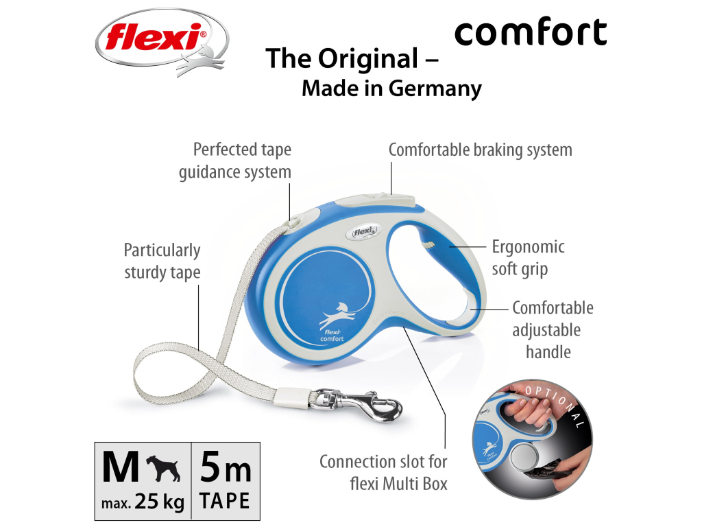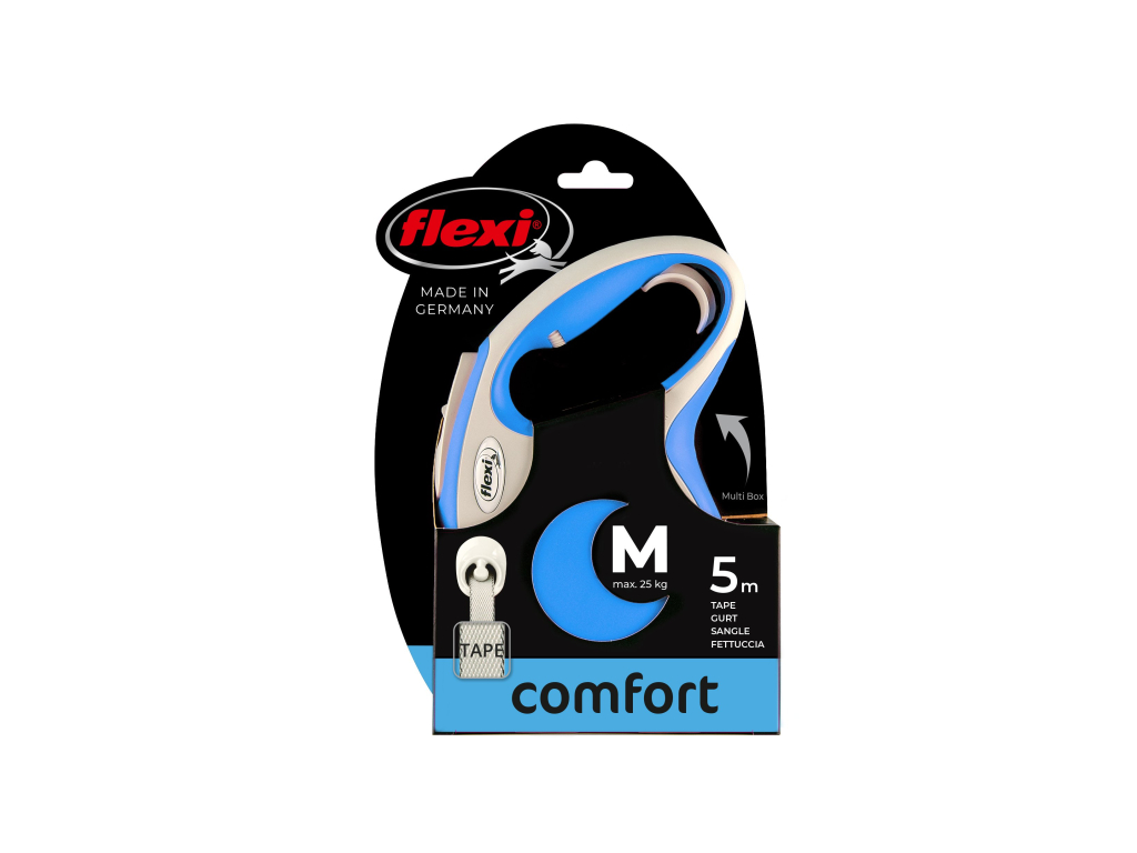 Pohodlné a díky svému dokonale sladěnému designu i unikátní - to je vodítko flexi® Comfort, které nabízí Vašemu čtyřnohému příteli vše, co psi milují: pohyb, pohyb a ještě jednou pohyb! Vás jistě potěší extra pohodlná, měkká rukojeť (ve velikosti M a L je navíc nastavitelná) i zdokonalený výstup a vedení pásku všemi směry bez zasekávání. Na každé procházce oceníte i bezpečný a intuitivní brzdový systém, který ve zlomku vteřiny zastaví pohyb psa. Pro snadné upevnění vodítka k obojku nebo postroji je vodítko opatřeno kvalitní chromovanou karabinou.