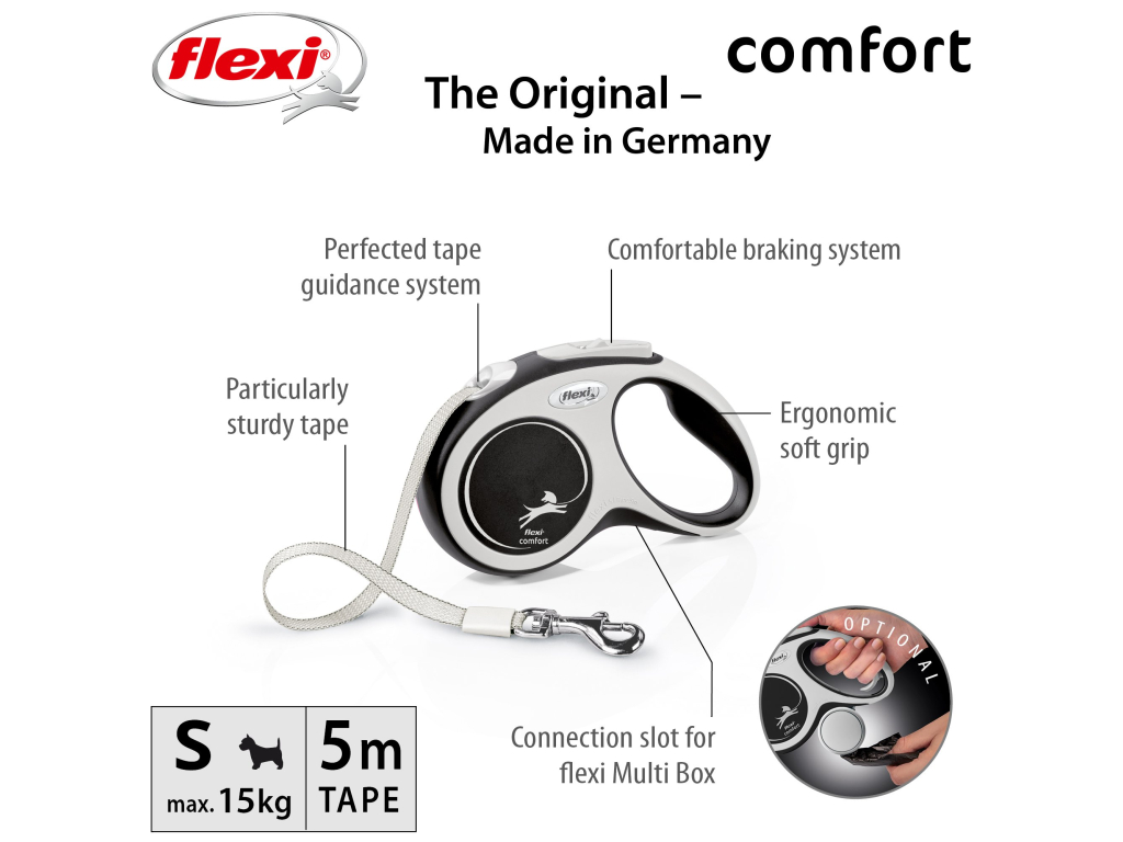 Pohodlné a díky svému dokonale sladěnému designu i unikátní - to je vodítko flexi® Comfort, které nabízí Vašemu čtyřnohému příteli vše, co psi milují: pohyb, pohyb a ještě jednou pohyb! Vás jistě potěší extra pohodlná, měkká rukojeť (ve velikosti M a L je navíc nastavitelná) i zdokonalený výstup a vedení pásku všemi směry bez zasekávání. Na každé procházce oceníte i bezpečný a intuitivní brzdový systém, který ve zlomku vteřiny zastaví pohyb psa. Pro snadné upevnění vodítka k obojku nebo postroji je vodítko opatřeno kvalitní chromovanou karabinou.