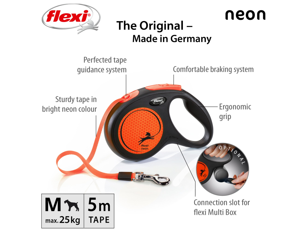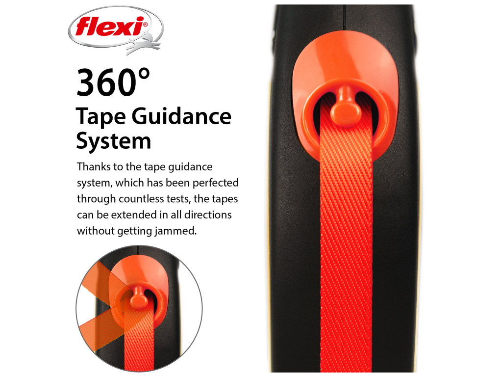 Flexi® Neon zároveň nabízí i nesčetnými testy zdokonalený výstup a vedení pásku všemi směry bez zasekávání. S délkou 5 m poskytuje Vašemu parťákovi potřebnou volnost pohybu.