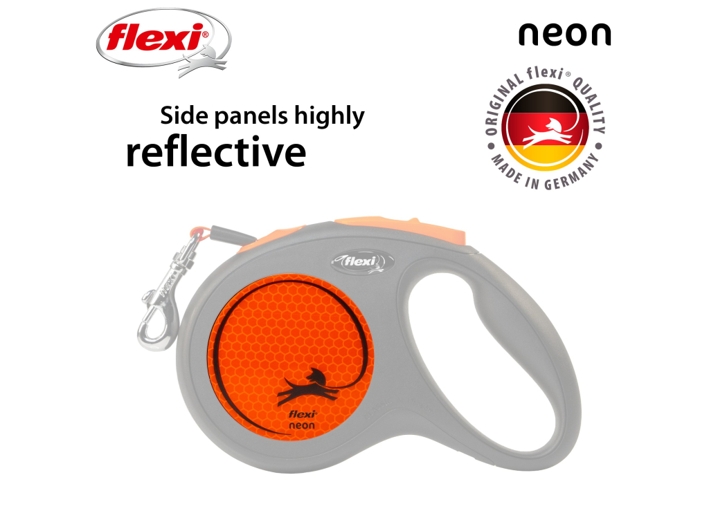 Flexi® Neon zaujme svou viditelností. Výrazný design vynikne za slunečného počasí a reflexní prvky za soumraku. Reflexní nálepka, která odráží světlomety až do vzdálenosti 150 m, představuje vítané zvýšení bezpečnosti a neonový pásek ve výrazné barvě už z dálky jasně ukazuje, že k sobě patříte :)