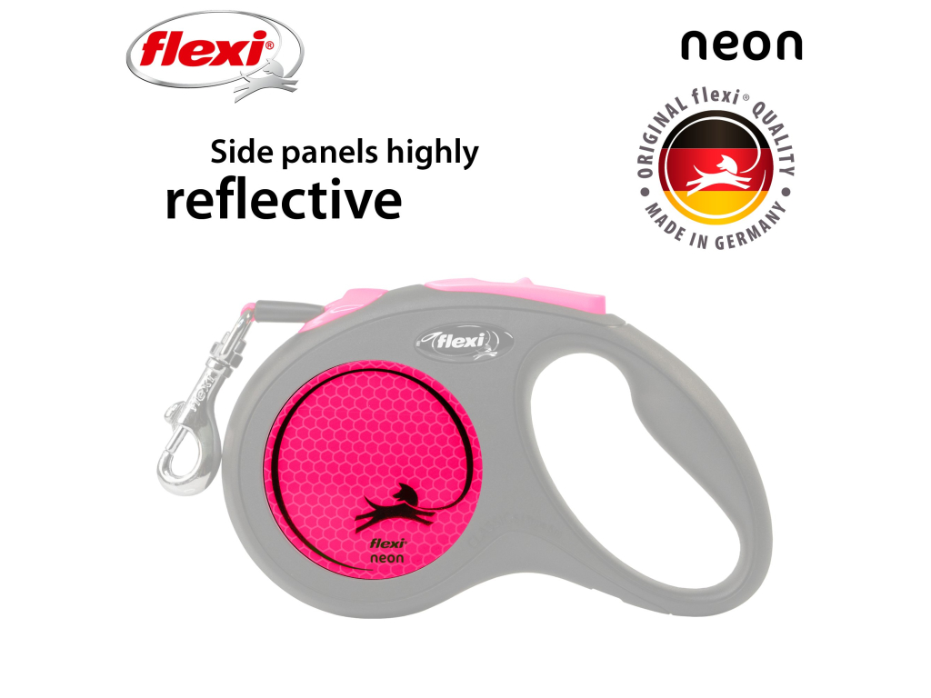 Flexi® Neon zaujme svou viditelností. Výrazný design vynikne za slunečného počasí a reflexní prvky za soumraku. Reflexní nálepka, která odráží světlomety až do vzdálenosti 150 m, představuje vítané zvýšení bezpečnosti a neonový pásek ve výrazné barvě už z dálky jasně ukazuje, že k sobě patříte :)
