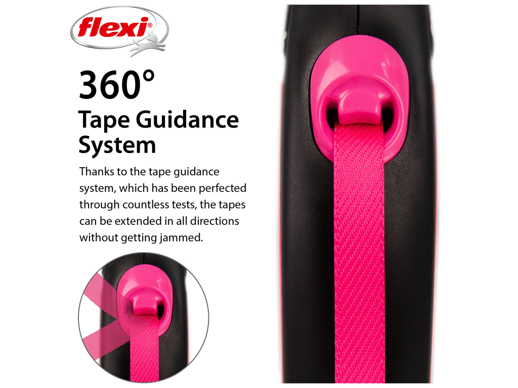 Flexi® Neon zároveň nabízí i nesčetnými testy zdokonalený výstup a vedení pásku všemi směry bez zasekávání. S délkou 5 m poskytuje Vašemu parťákovi potřebnou volnost pohybu.
