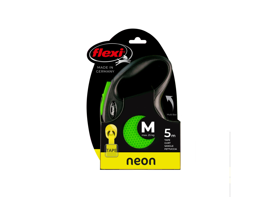 Flexi® Neon zároveň nabízí i nesčetnými testy zdokonalený výstup a vedení pásku všemi směry bez zasekávání. S délkou 5 m poskytuje Vašemu parťákovi potřebnou volnost pohybu.
