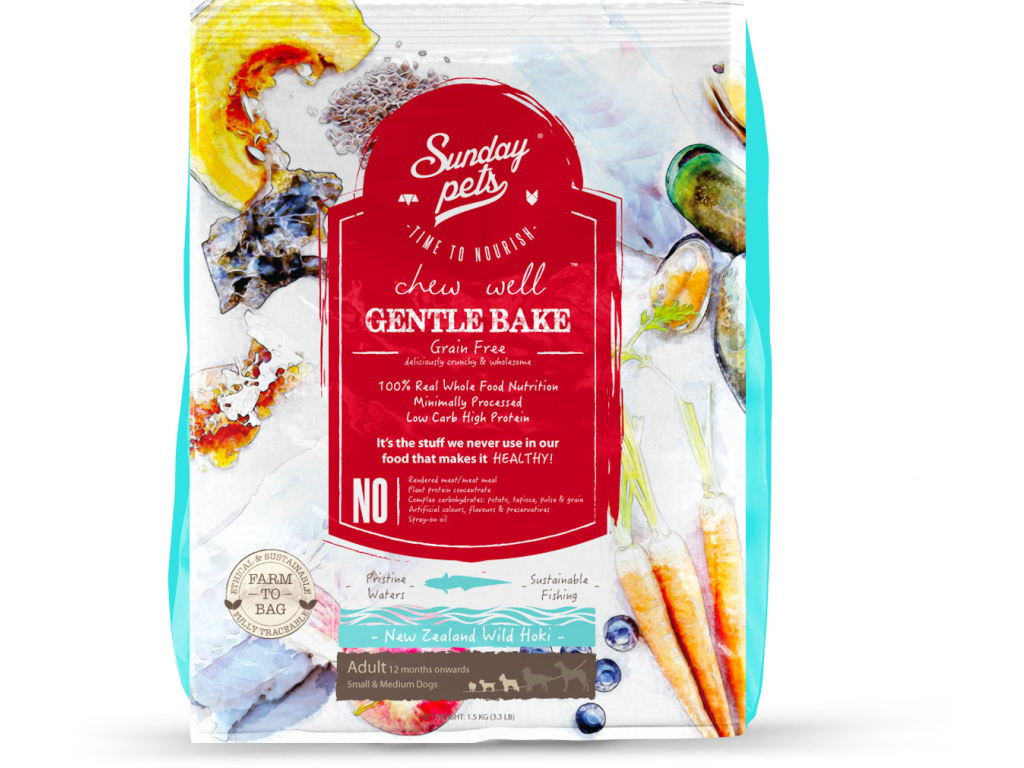 Kompletní a vyvážené krmivo SundayPets Dog Gentle Bake Hoki pro dospělé psy malých a středních plemen od 12 měsíců věku.