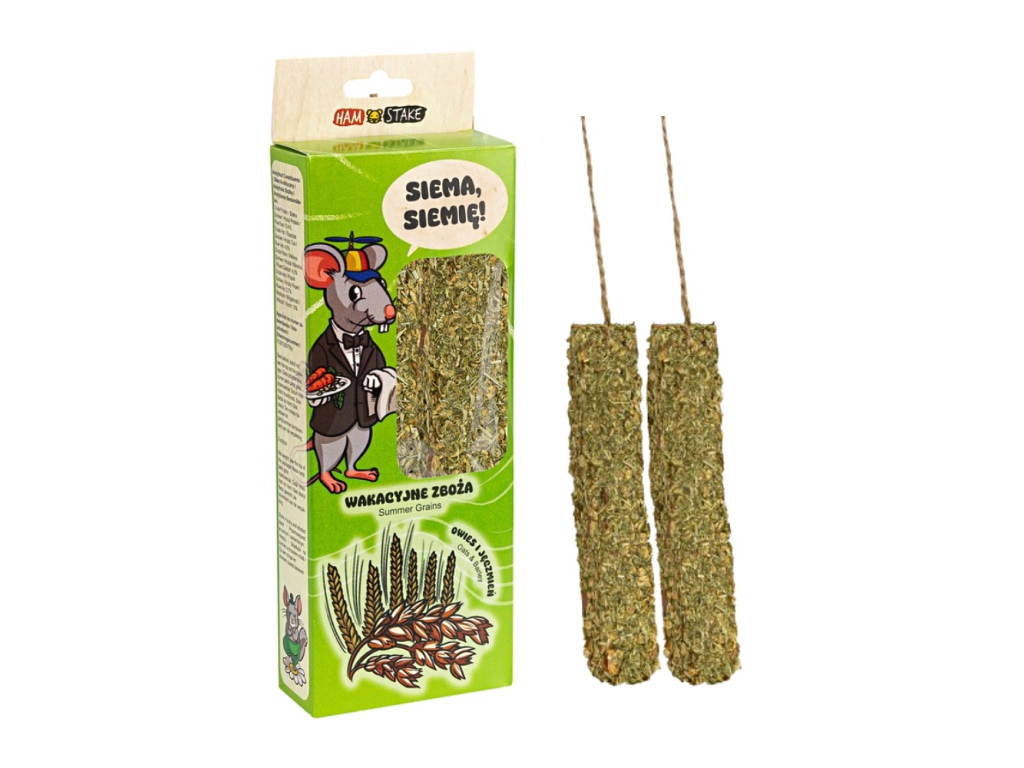 Ham Stake přírodní pamlsek pro hlodavce ve tvaru tyčinky na provázku s příchutí letního obilí.
