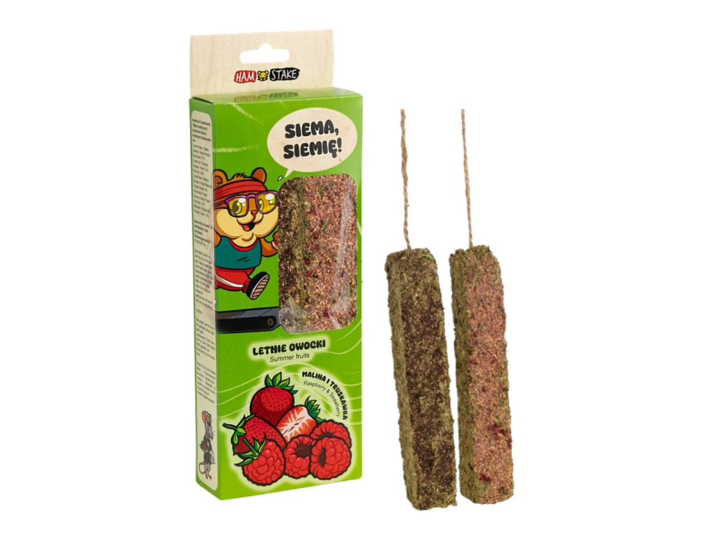Ham Stake přírodní pamlsek pro hlodavce ve tvaru tyčinky na provázku s příchutí letního ovoce.