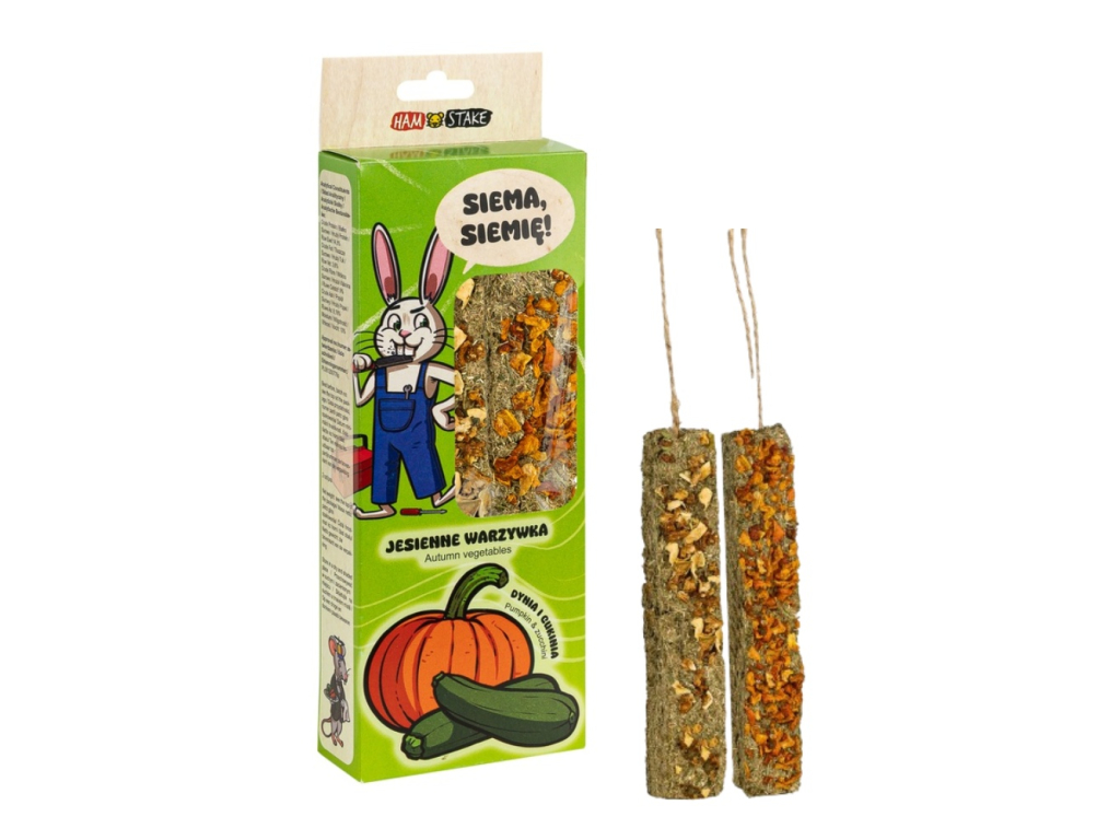 Ham Stake přírodní pamlsek pro hlodavce ve tvaru tyčinky na provázku s příchutí podzimní zeleniny.