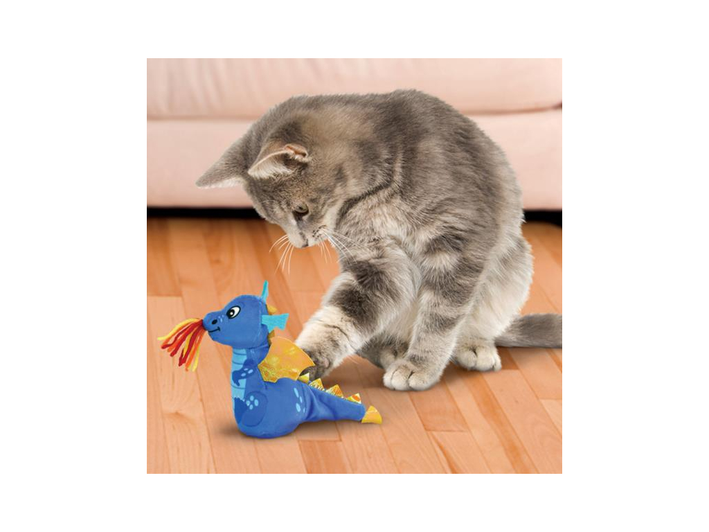 Plyšový drak plivající oheň z řady KONG Enchanted je měkký, šustivý a naplněný prémiovou šantou. Šanta kočičí (catnip) je přírodní nenávyková bylina, která povzbuzuje ke hře až 70 % koček. Lovecký instinkt kočky podněcují také barevná plandavá křídla a třásně.