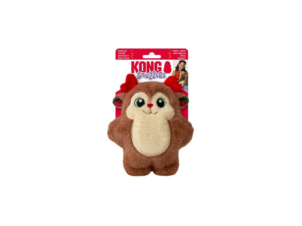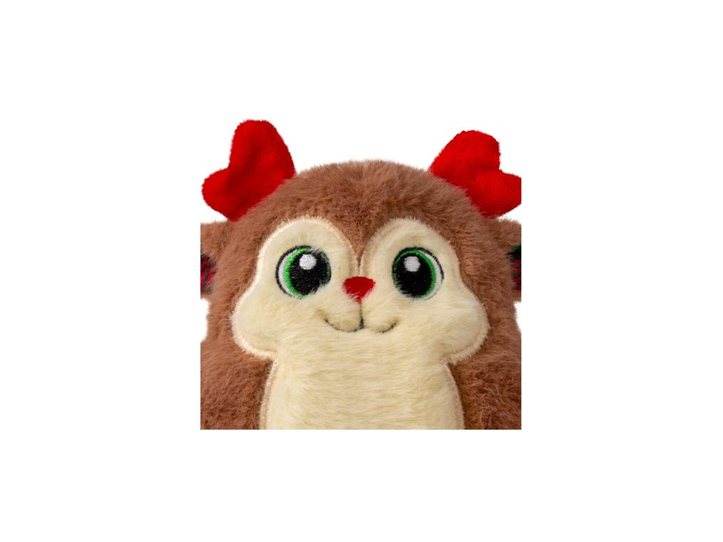 Sametově hebký plyšový sob KONG Holiday Snuzzles Reindeer láká nejen k mazlení, ale i k divočejším hrátkám díky odolnému pískacímu polštářku, který vyplňuje celé jeho tělo. Jemný plyš a zploštělý tvar dělají z kousání a nošení této hračky v tlamě skutečný požitek.