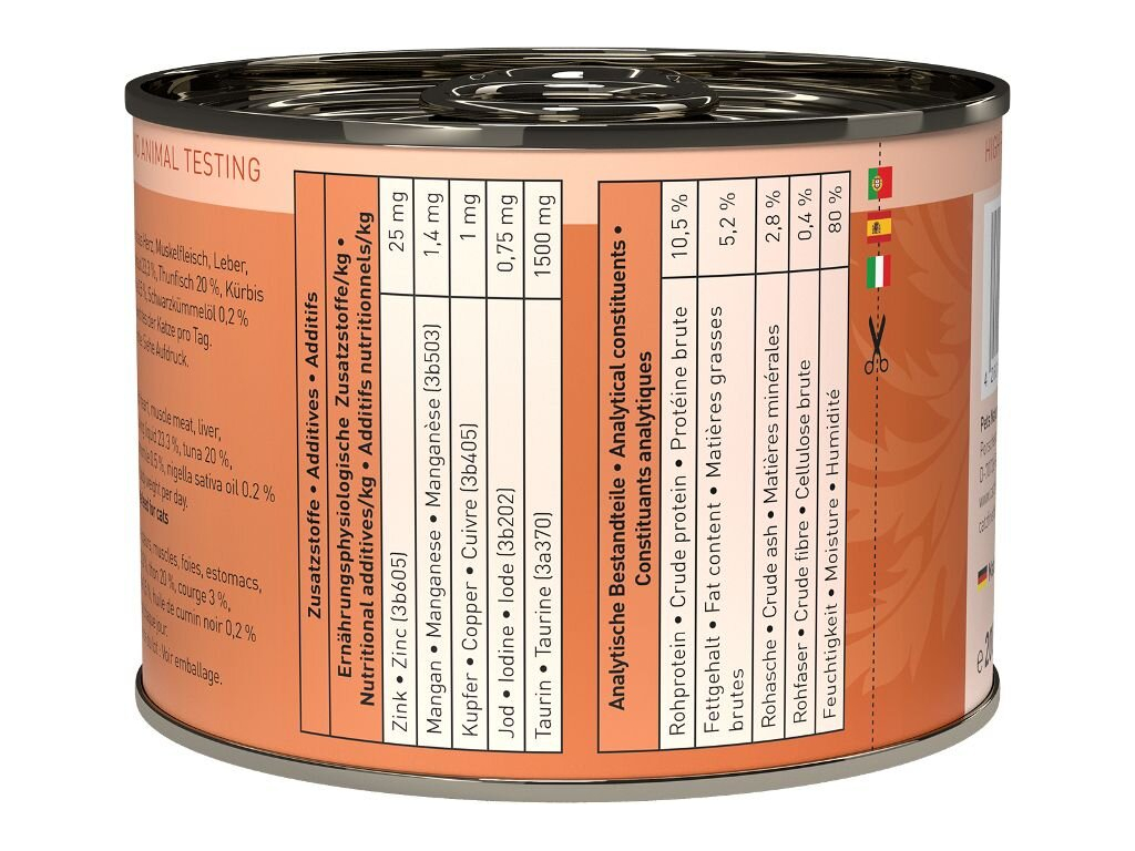 Složení: kuřecí maso 50% (srdce, svalovina, játra, žaludek, krk a tuk), vývar z kuřete a tuňáka 23,3%, tuňák 20%, dýně 3%, šípky 2%, minerály 1%, heřmánek 0,5%, olej ze semen černuchy seté 0,2%