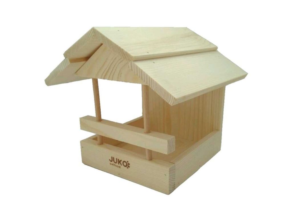 Elegantní dřevěné krmitko určené pro podzimní a zimní přikrmování volného ptactva.