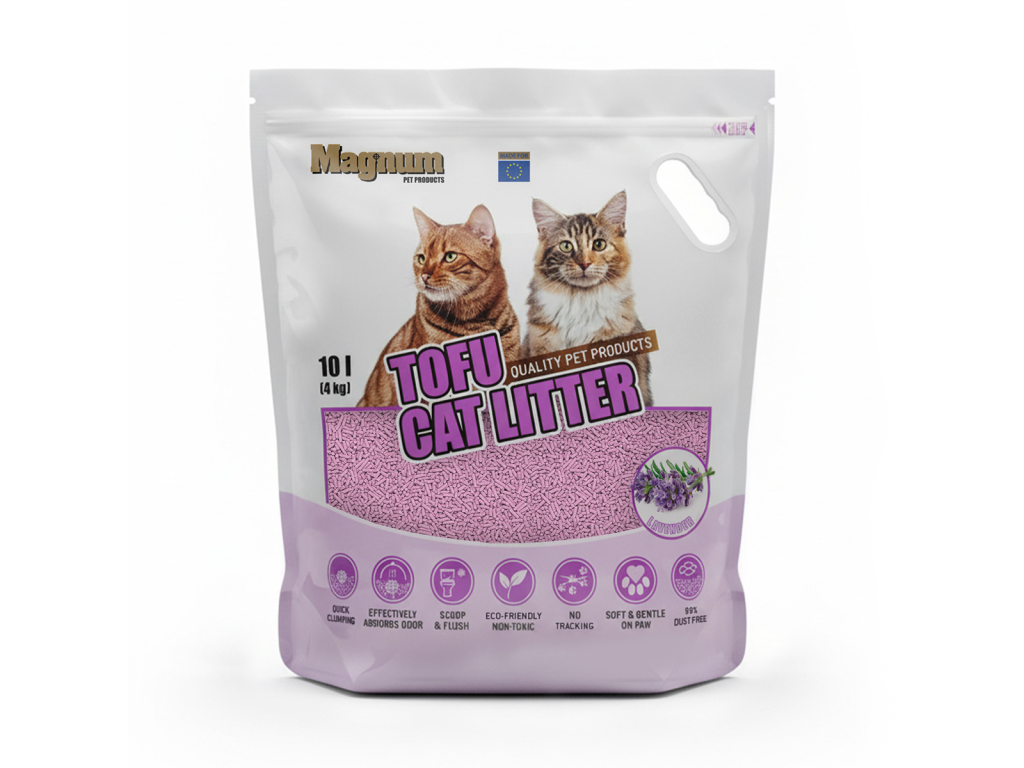 Ekologická podestýlka Magnum Tofu Lavender představuje moderní a udržitelnou alternativu k běžným stelivům. Vyrábí se ze sójové drti – vedlejšího produktu při výrobě tofu – a je tak šetrná nejen ke kočkám, ale i k přírodě. Díky přirozené vláknité struktuře rychle vytváří pevné hrudky, které se snadno odstraňují, čímž udržují toaletu čistou a bez zápachu.
