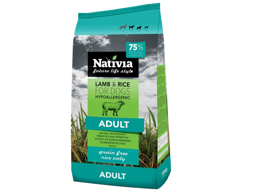 České hypoalergenní krmivo Nativia s jehněčím masem pro dospělé psy s citlivým zažíváním. Krmivo obsahuje juku pro snížení zápachu exkrementů, vyvážený poměr omega 3 a 6 mastných kyselin pro krásnou a zdravou srst a navíc je velice snadno stravitelné. Jediným zdrojem sacharidů je kvalitní rýže - Nativiva neobsahuje kukuřici, pšenici ani sóju. Podíl živočišných bílkovin v krmivu je 65%. Vhodné pro psy od 18-ti měsíců věku.