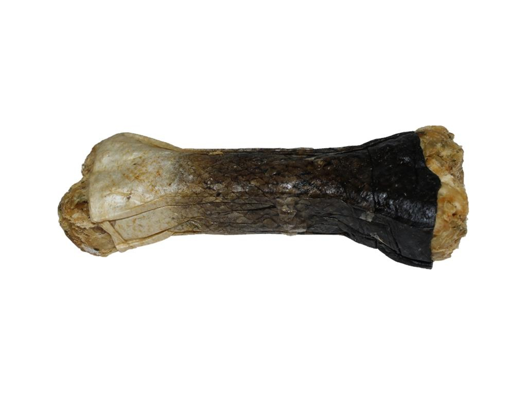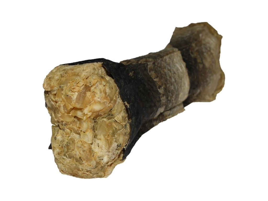 Buvolí kost pro psy plněná špenátem a kurkumou a obalená kůží z lososa. Velikost 17 cm.Více informací