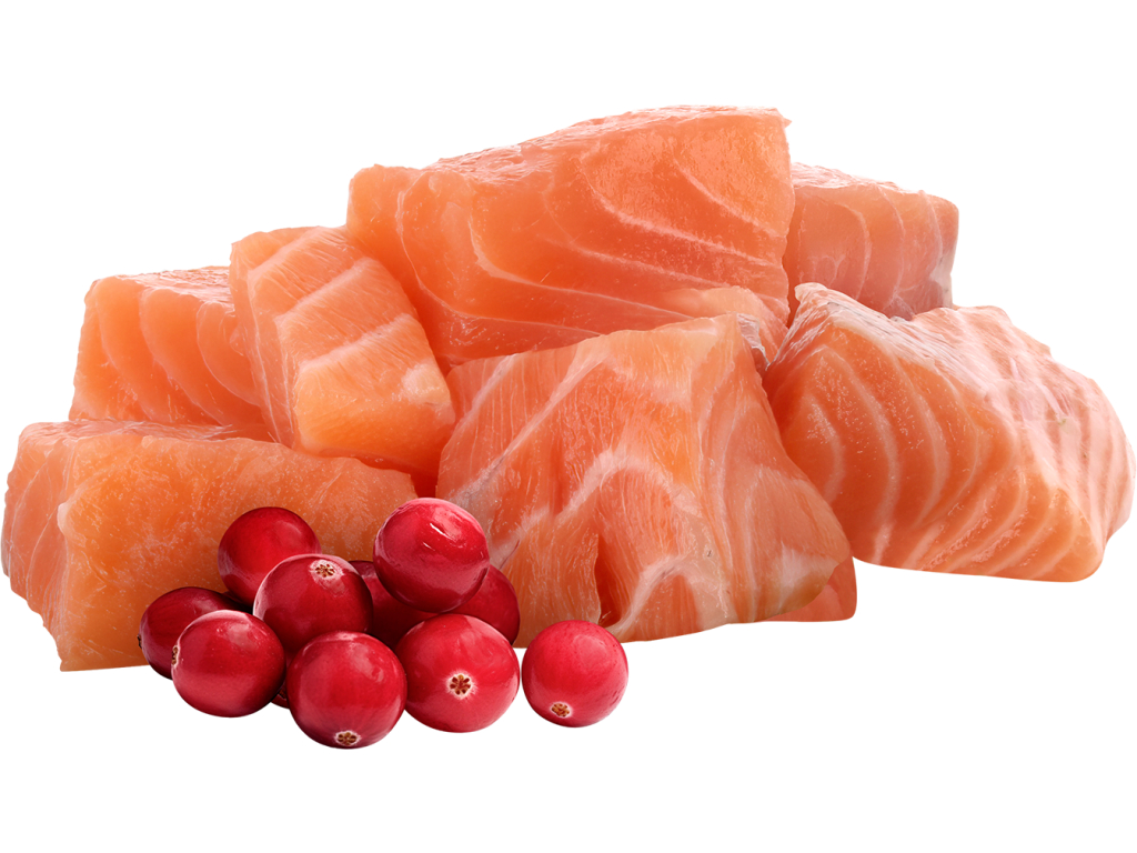 Složení: maso a vedlejší výrobky živočišného původu (kousky masa 76 %, z toho kuřecí maso 14 %), ryby a vedlejší výrobky z ryb (kousky lososa 11,6 %), minerální látky, hrachový škrob, hrachová bílkovina, inulin z čekanky 0,4 %, lignocelulóza, sušené brusinky 0,1 %