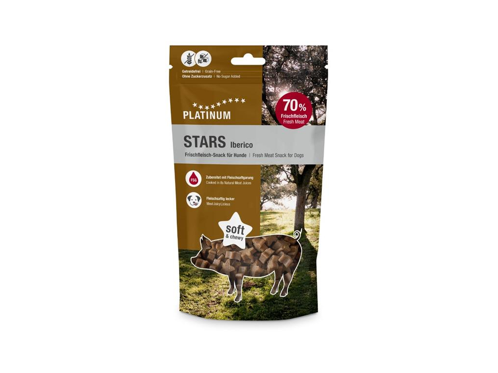 Platinum Stars Iberico jsou bezobilné (grain-free) pochoutky pro psy připravené z čerstvého masa – svou velikostí ideální pro výcvik a odměňování. Kousky čerstvého iberského vepřového masa jsou pomalu vařené ve vlastní šťávě a poté se jemně sušší. Maso si tak uchová všechny důležité živiny, bohatou chuť a lahodnou vůni. Poloměkké pamlsky ve tvaru hvězdičky mají díky vysokému podílu čerstvého masa a přidaným bylinkám a omega-3 mastným kyselinám pozitivní vliv na zdraví psa.