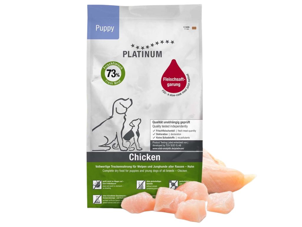 Platinum Natural Puppy Chicken je přírodní krmivo pro štěňata. Je snadno stravitelné a zaručuje zdravý vývoj v silného jedince již od prvních týdnů (vhodné od 3. týdne). Krmivo obsahuje za studena lisované oleje (pro optimální poměr Omega 3 a 6 mastných kyselin) a vitamín K1 (pro optimální růst kostry a svalstva).