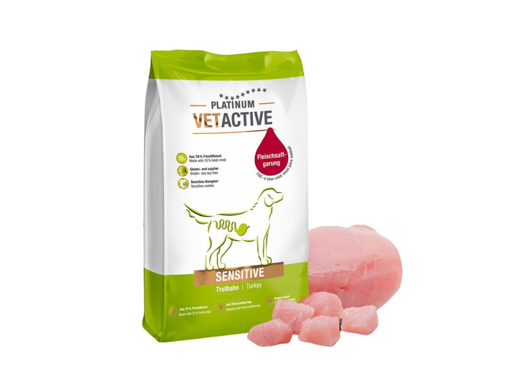 Platinum Vetactive Sensitive je obzvláště snadno stravitelné krmivo, ideální pro citlivé psy. Unikátní způsob přípravy čerstvého masa Fleischsaftgarung (FSG) vzal inspiraci od technik kuchařů, kteří si zakládají na ještě chutnějším a zdravějším mase.
