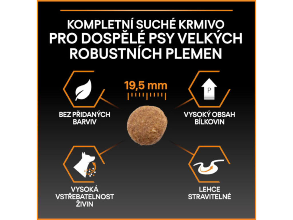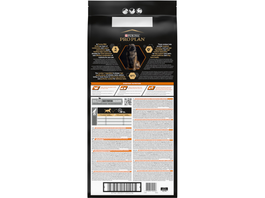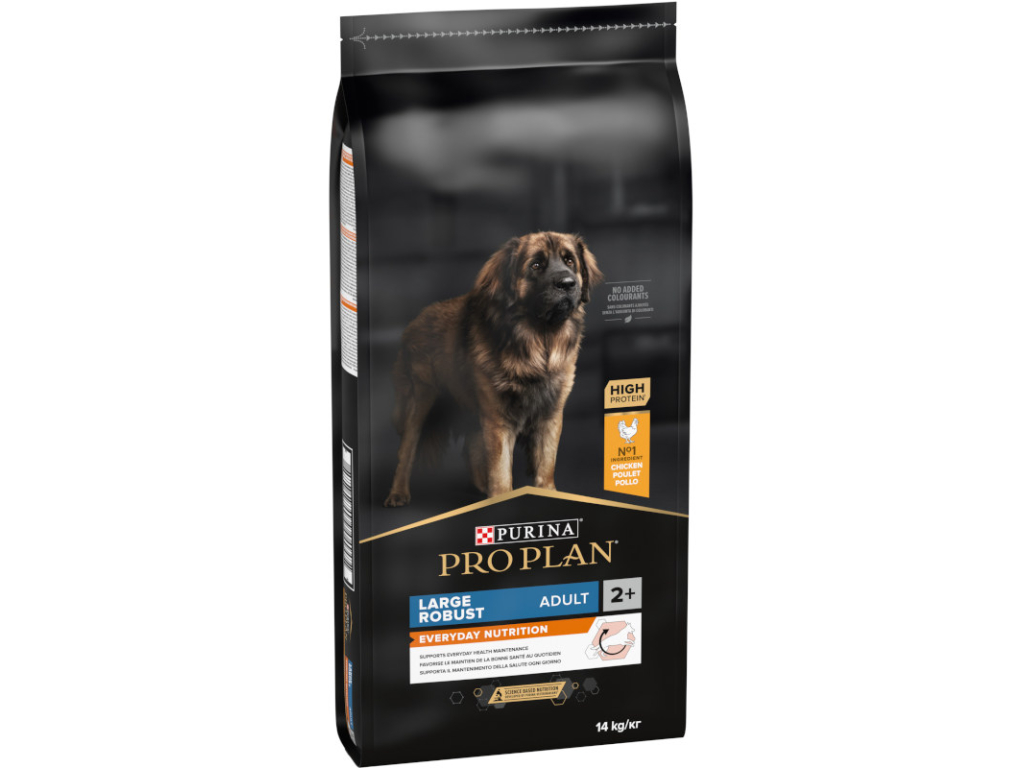Krmivo Purina PRO PLAN® Everyday Nutrition LARGE ADULT ROBUST bylo vyvinuto pro dospělé psy velkých, robustních plemen (s hmotností nad 25 kg). Granule obsahují vitamín D, minerální látky a specifické množství omega-3 mastných kyselin (0,3 %), které přispívají ke zdraví zubů a dásní. Krmivo má vysoký podíl kvalitního kuřecího, a tak zajišťuje optimální výživu velkých plemen od 24 měsíců až do 7 let věku. Následně byste měli přejít na produkty z řady Age Defence.