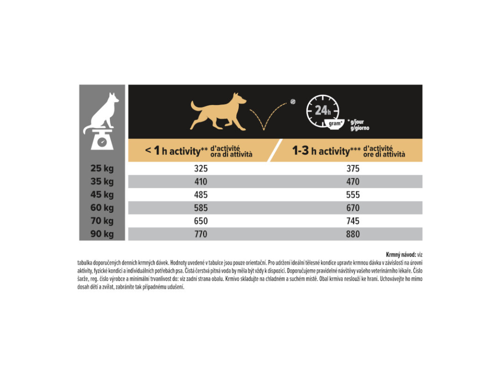 Krmný návod: viz tabulka doporučených denních krmných dávek. Hodnoty uvedené v tabulce jsou pouze orientační. Pro udržení ideální tělesné kondice upravte krmnou dávku v závislosti na úrovni aktivity, fyzické kondici a individuálních potřebách psa. Čistá čerstvá pitná voda by měla být vždy k dispozici. Doporučujeme pravidelné návštěvy vašeho veterinárního lékaře.
