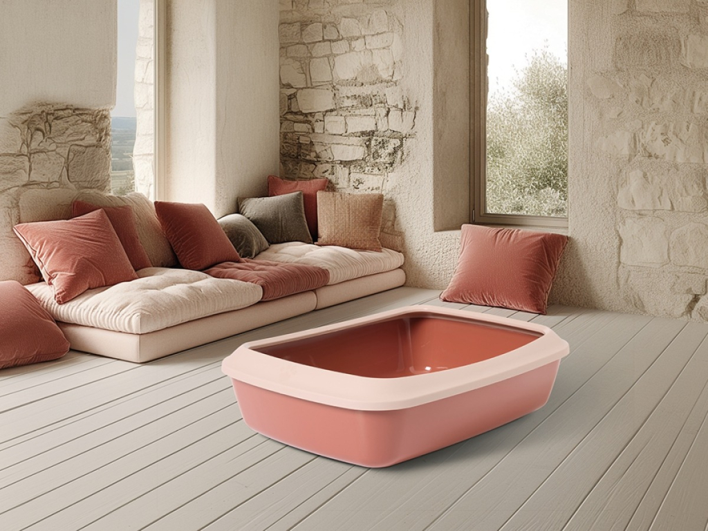 Praktická kočičí toaleta s čistým a rafinovaným designem vyrobená z vysoce kvalitního recyklovaného plastu.