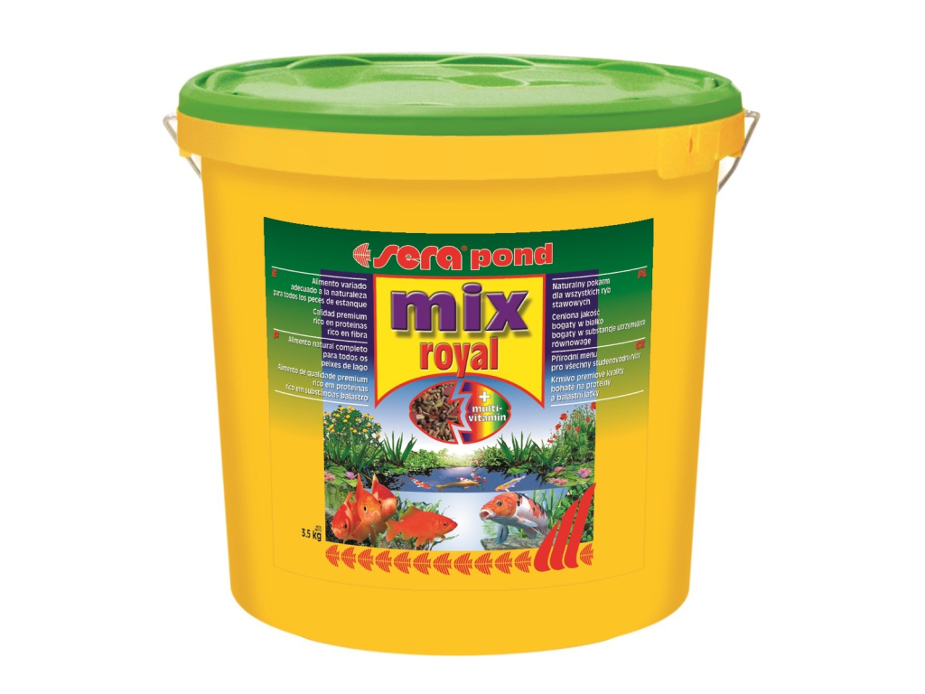 Sera Pnd Mix Royal je pestrá směs pro rozmanité jezírkové ryby. Snadno stravitelné vločky jsou ideálním zdrojem pro menší rybky. Tyčinky bohaté na energii zajistí vyváženou potravu pro velikost od 6 cm. Vyvážená strava obsahuje také lyofilizované přírodní blešivce, jako speciální pamlsek pro všechny ryby a lze ji podávat po celý rok. Díky tvarové stabilitě toto krmivo neznečišťuje vodu.