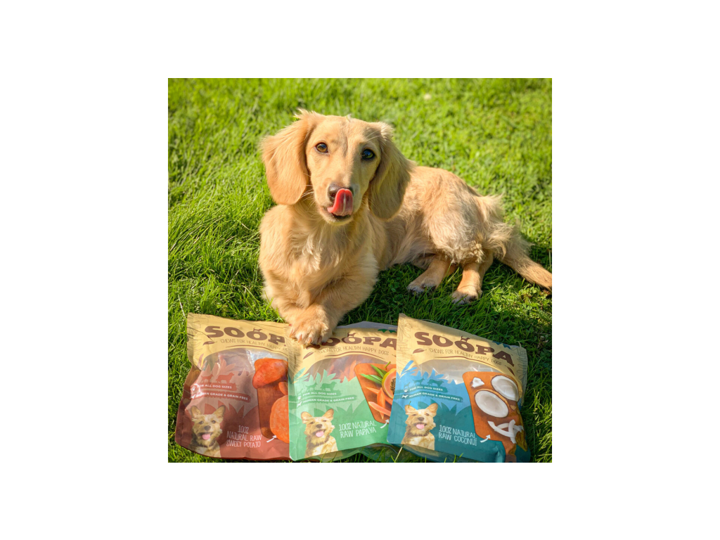 Soopa Chews jsou vhodné pro psy od 3 měsíců věku; bez dozoru doporučeno od 6 měsíců. K dostání jsou ve třech druzích: Papáju a batáty lze psům podávat i ve vyšším množství, kokos má však detoxikační účinky, proto by měl být podáván pouze v menším množství. Vzhledem k vyššímu obsahu vlákniny se mohou ve stolici objevit drobné nestrávené zbytky, což je běžné a neškodné.
