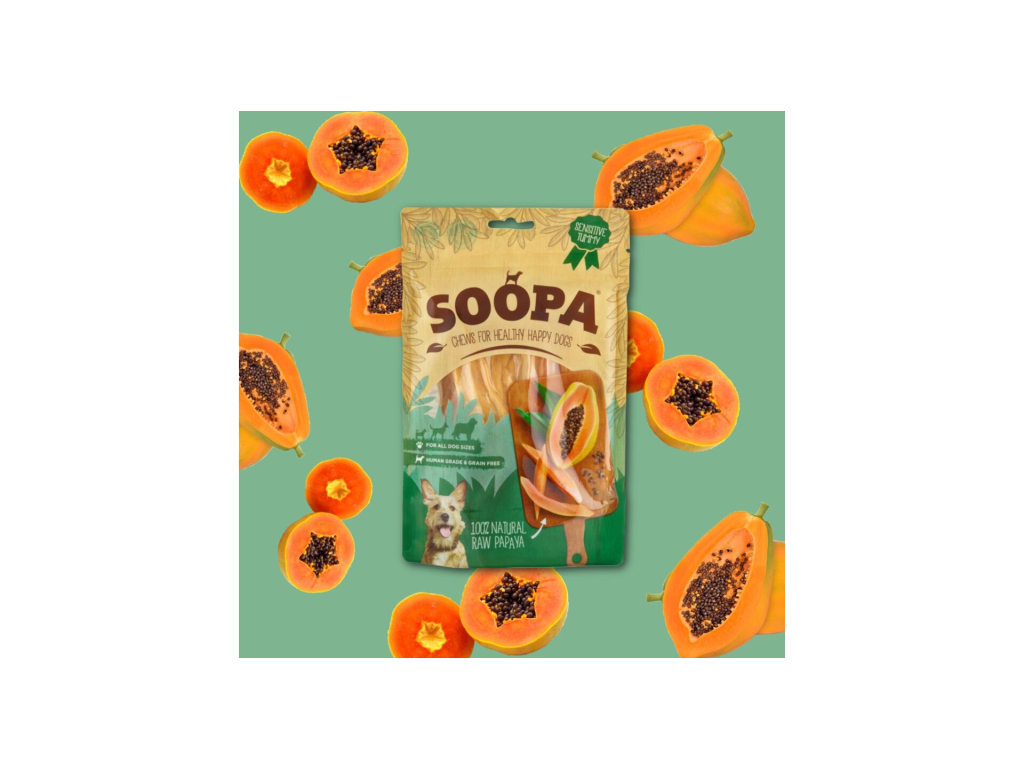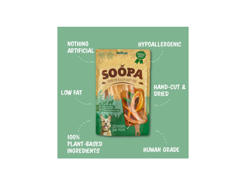 Množství podávaného pamlsku vždy přizpůsobte hmotnosti, aktivitě a celkové kondici psa. Zajistěte dostatek pitné vody. Soopa Chews jsou vhodné pro psy od 3 měsíců věku; bez dozoru doporučeno od 6 měsíců. K dostání jsou ve třech druzích: Papáju a batáty lze psům podávat i ve vyšším množství, kokos má však detoxikační účinky, proto by měl být podáván pouze v menším množství. Vzhledem k vyššímu obsahu vlákniny se mohou ve stolici objevit drobné nestrávené zbytky, což je běžné a neškodné.