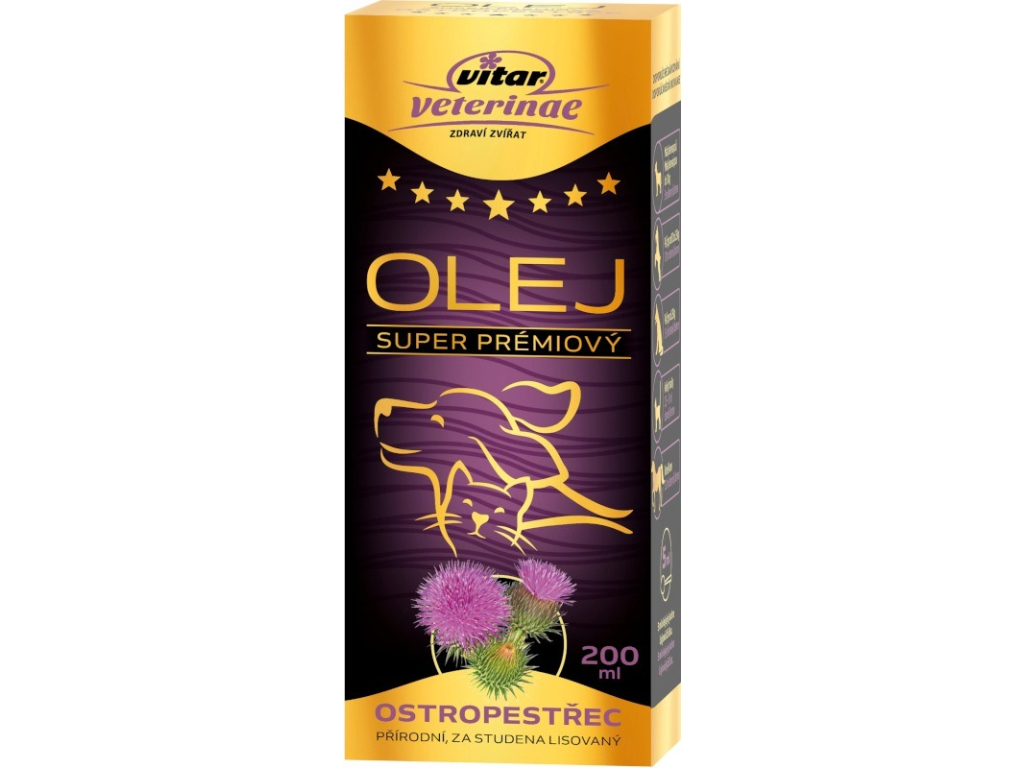 VITAR Veterinae Ostropestřec panenský olej je získáván z rostlin ostropestřce mariánského, obsahuje všechny olejové složky v jejich přírodním poměru a kvalitě. Je zdrojem esenciálních nenasycených mastných kyselin a vitaminů