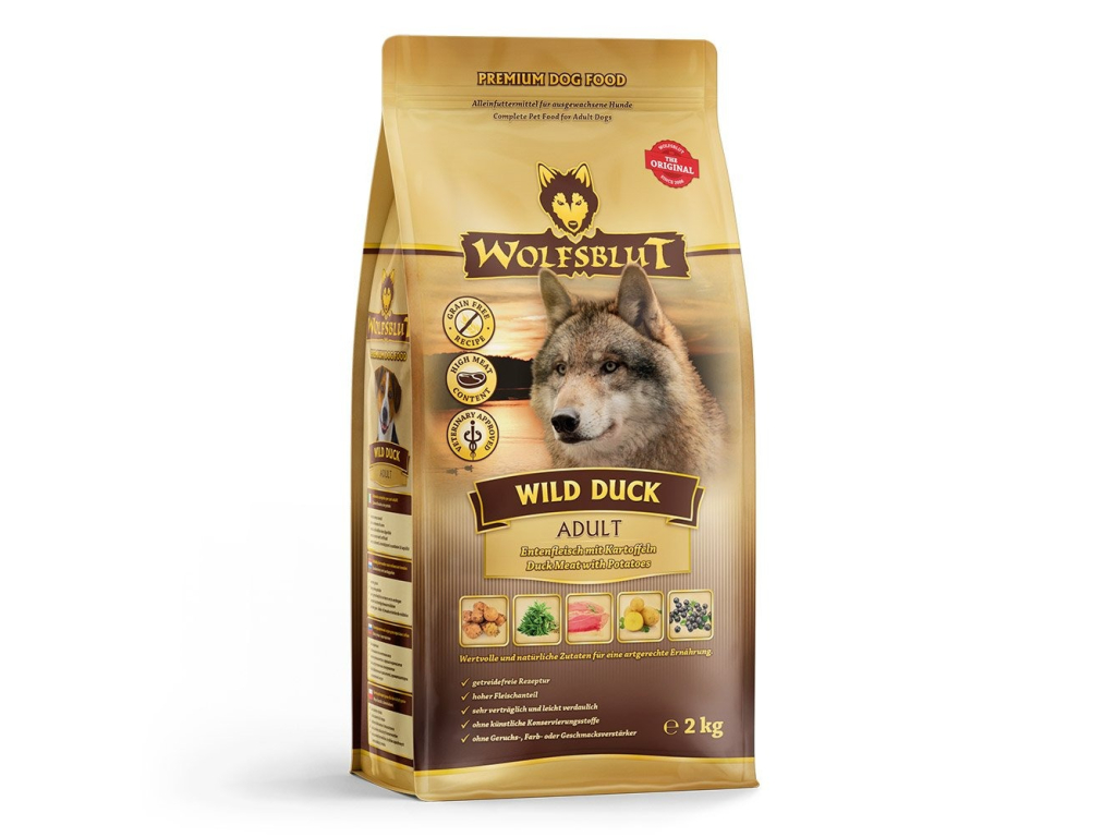 Vlci loví svou kořist od Skalistých hor Severní Ameriky, arktické tundry, hor a lesů Evropy až po pouště a stepi střední Asie. To jim dodává maso a vnitřnosti bohaté na živiny, ale také zeleninu, ovoce, bobule, kořeny a bylinky z obsahu žaludku kořisti. Obilí zde není zahrnuto. Vlk tak přijímá potřebné vitamíny, minerály, stopové prvky, enzymy a druhotné rostlinné látky. Vzhledem k tomu, že vlk je předkem všech psů, naše mokré krmivo Wolfsblut je založeno na přirozených stravovacích návycích vlka. Obsahuje hodně masa nebo ryb v kombinaci se superpotravinami, které obsahují hodnotné ingredience – stejně jako v přírodě, bez obilovin. Náš výběr výjimečných druhů masa a superpotravin bohatých na živiny vychází z vlčích biotopů a jejich pestré stravy. Wolfsblut nabízí každému psovi druhově vhodnou a originální stravu a díky rozmanitosti odrůd si každý najde něco, co snese. Jednotlivé složky potravy WILD DUCK byly sestaveny veterináři tak, aby vyhovovaly přirozenému chování vlka kořisti a poznatkům o holistické výživě psů. Suché krmivo WILD DUCK kombinuje vysoce kvalitní zdroje bílkovin a lehce stravitelné sacharidy, které jsou dokonale přizpůsobeny přirozeným potřebám vašeho psa. Kachní maso poskytuje cenné bílkoviny a je zvláště šetrné pro psy s citlivým žaludkem. Brambory jsou výborným bezlepkovým zdrojem sacharidů a podporují stabilní trávení.